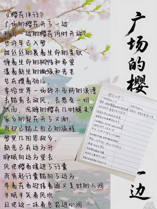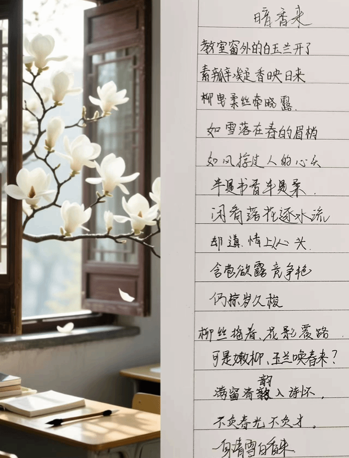 在诗词接力环节,同学们被分为两队,分别以“教室窗外的白玉兰开了”和“广场的樱花开了一边”作为开篇,现场开展接力创作。同学们于诵读中汲取灵感,在思维碰撞间迸发诗意。在此过程中,《暗香来》与《樱花伴行》两首原创诗作应运而生,字里行间饱含着春日的浪漫气息与少年的真挚情感。
